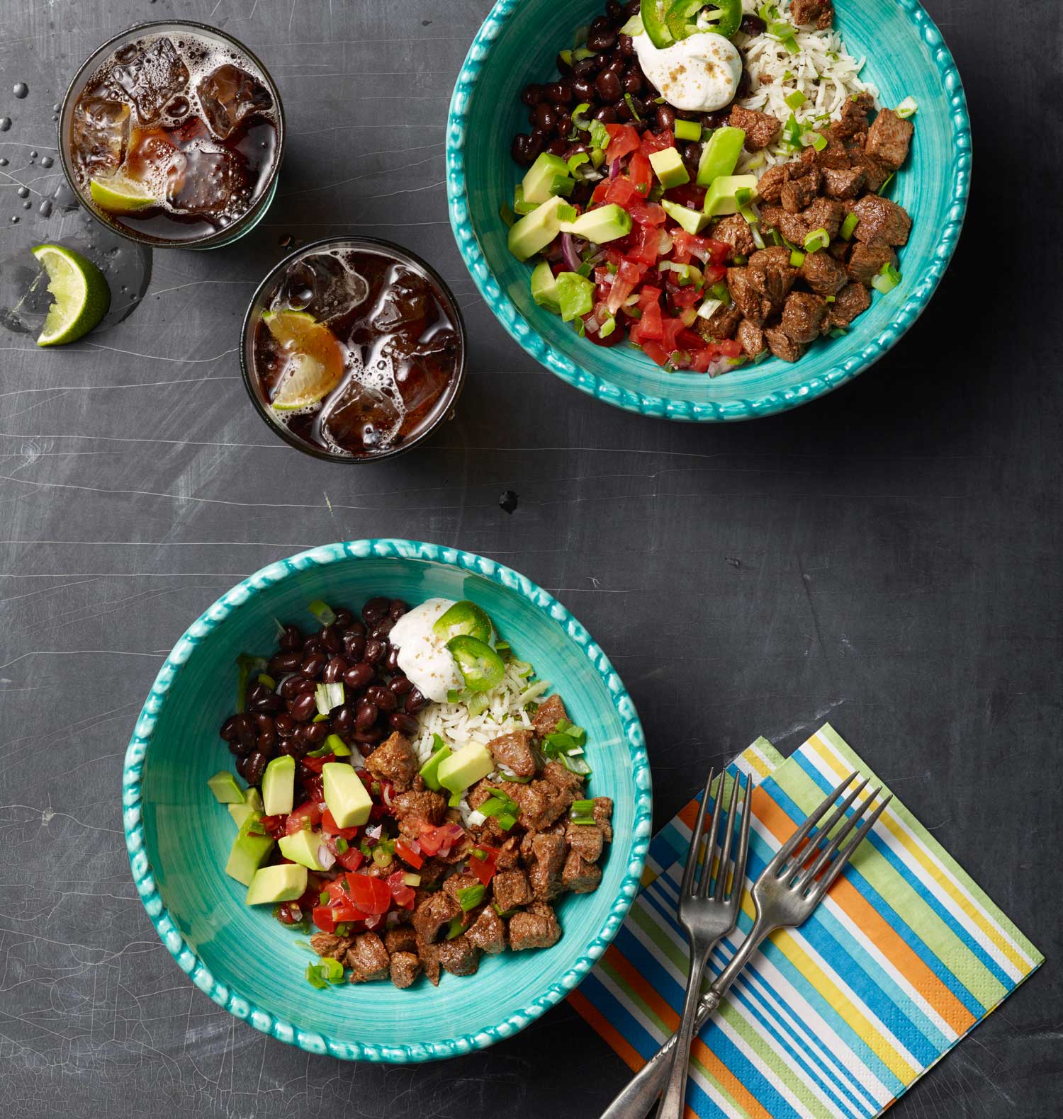 เสิร์ฟ: ทุกครั้งที่เสิร์ฟ ให้วางข้าวโรยผักชี ½ ถ้วย ตรงก้นชามใบใหญ่และโปะด้วยเนื้อวัวหั่นเต๋าหนึ่งในสี่ส่วน (4 ออนซ์) ด้านบน ซัลซ่า ¼ ถ้วย ถั่วดำ ¼ ถ้วย อะโวคาโด้หนึ่งในสี่ส่วน ครีมเปรี้ยว 1 ช้อนโต๊ะ ยี่หร่า ¼ ช้อนชาและต้นหอม 1 ช้อนชา เสิร์ฟทันที