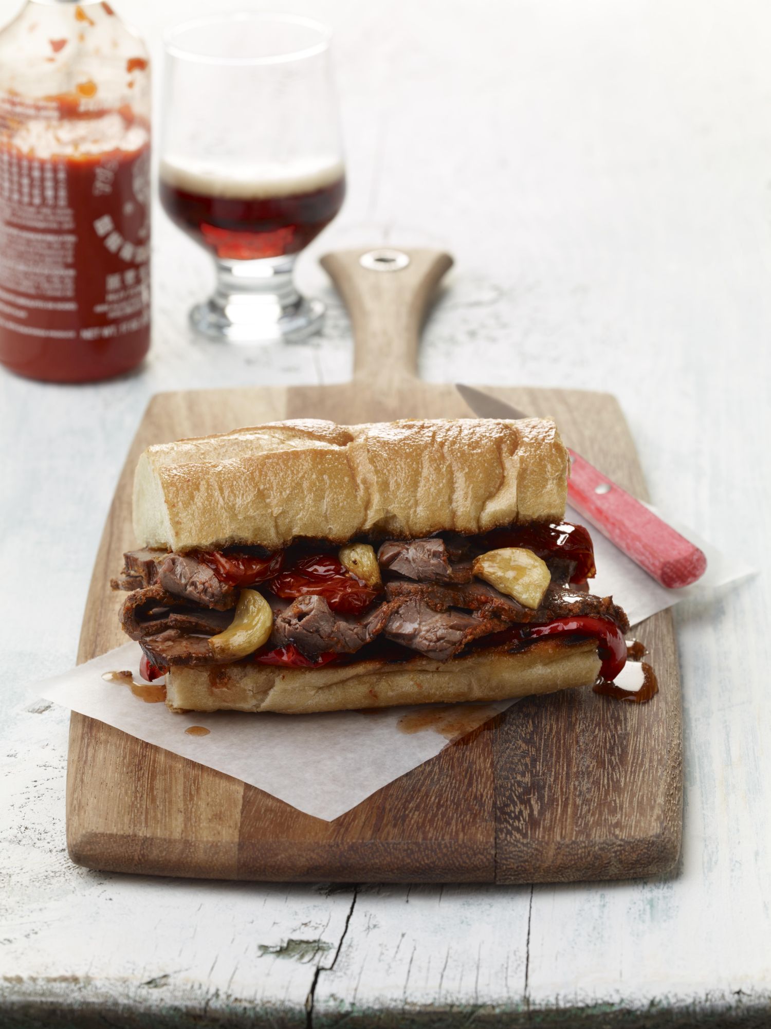 ซอสพริกศรีราชาช่วยเพิ่มความเผ็ดเล็กน้อยให้กับแซนวิชเนื้อวัวออสเตรเลีย ที่เลี้ยงด้วยหญ้าย่างที่ใช้เทคนิคการทำสุกแบบไฟอ่อนย่างนาน (หรือที่เรานิยมเรียกกันในออสเตรเลียว่า “sanger”)