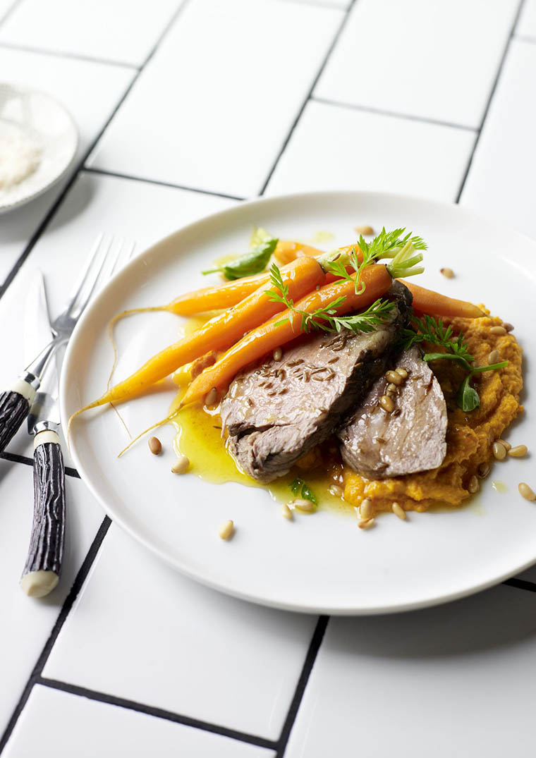 Spoon the warm carrot puree onto your serving dish, place the lamb on top and finish with the baby carrots, a drizzle of burnt butter and sprinkle of toasted pine nuts.