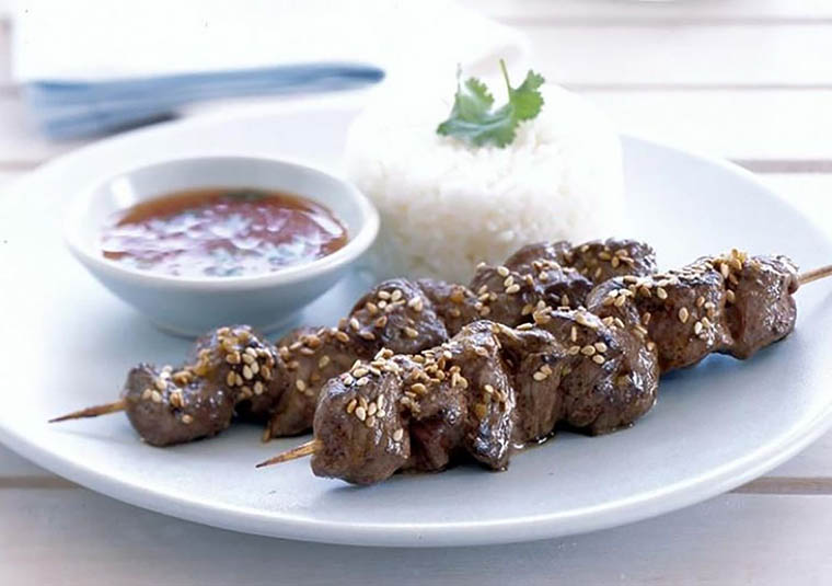Heat a barbecue or char grill and cook 3-4 minutes on each side or until the lamb is cooked. Serve sprinkled with the toasted sesame seeds (optional) and the dipping sauce and steamed jasmine rice.