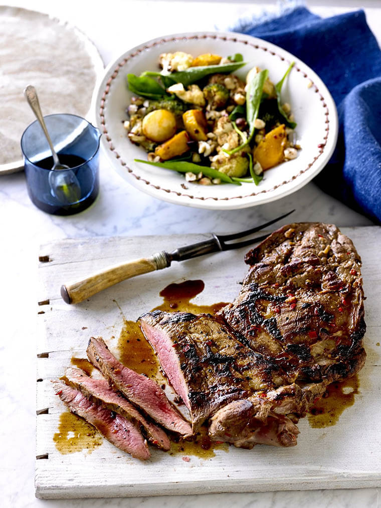 For the chili vegetable salad: Preheat oven to 400°F / 200°C (180° fan-forced). In a large roasting pan lined with baking paper, place the pumpkin, potatoes, cauliflower and broccoli. Drizzle with the olive oil, and sprinkle with the spices. Season and toss to coat. Roast vegetable for 30 to 35 minutes, turning once, or until golden and tender. Add spinach to the pan, toss and sprinkle with hazelnuts.
