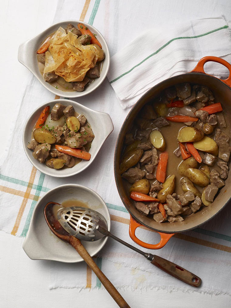 For the phyllo: Working with one square of phyllo and keeping the rest covered with a towel, brush ¼ of the butter on the phyllo. Twist it into a knot shape and sprinkle it with ¼ of the paprika. Repeat with the remaining phyllo. Transfer the phyllo knots to a piece of parchment and slide the parchment onto a baking sheet. Bake until golden and crispy, 10 to 15 minutes. Ladle the lamb stew into bowls, top each with one knot of phyllo, and sprinkle with the parsley.