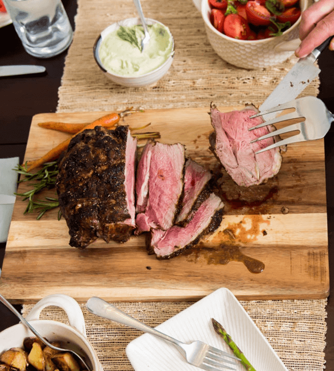 Grilled and braised Mediterranean leg of Aussie lamb with roasted potatoes, blistered tomatoes and a coconut avocado tzatziki