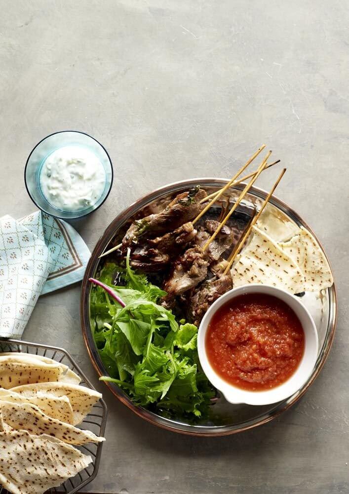 Serve lamb kebabs alongside your favorite salad or on rice, topped with the tomato sauce and crisp Lebanese bread spread with Greek yogurt.