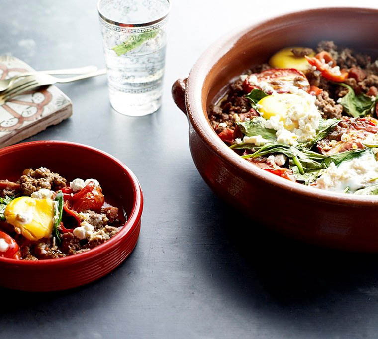 Crack the eggs into the mixture, reduce the flame and cover with a lid, cooking slowly until the eggs are to your liking. Serve with bread.
