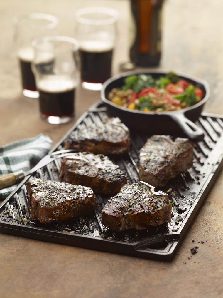 Chef Thomas Horner designed this recipe to make a quick and simple dinner while drinking a beer. Leafy greens, sweet peppers and white beans turn into a hearty ragout to accompany the herbed chops.