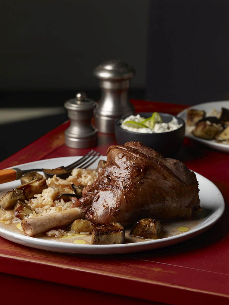 For the rice: Bring a MEDIUM pot of water to a boil, add the rice, and cook until al dente (per package instructions). Drain and put the rice back in the pot. Put the pot back on MEDIUM heat and steam the rice gently, until a crust forms on the bottom and the rice is nice and fluffy. In a small bowl, combine the yogurt, chile, lime zest and salt to taste and reserve. When the shanks are falling off the bone, carefully remove them from the braising liquid and pull the meat off the bones. Strain the braising liquid, discard the vegetables, and reduce the liquid until it is glossy. Add the lamb meat back to the liquid. Serve the lamb with the eggplant, rice, yogurt sauce and chopped cilantro.