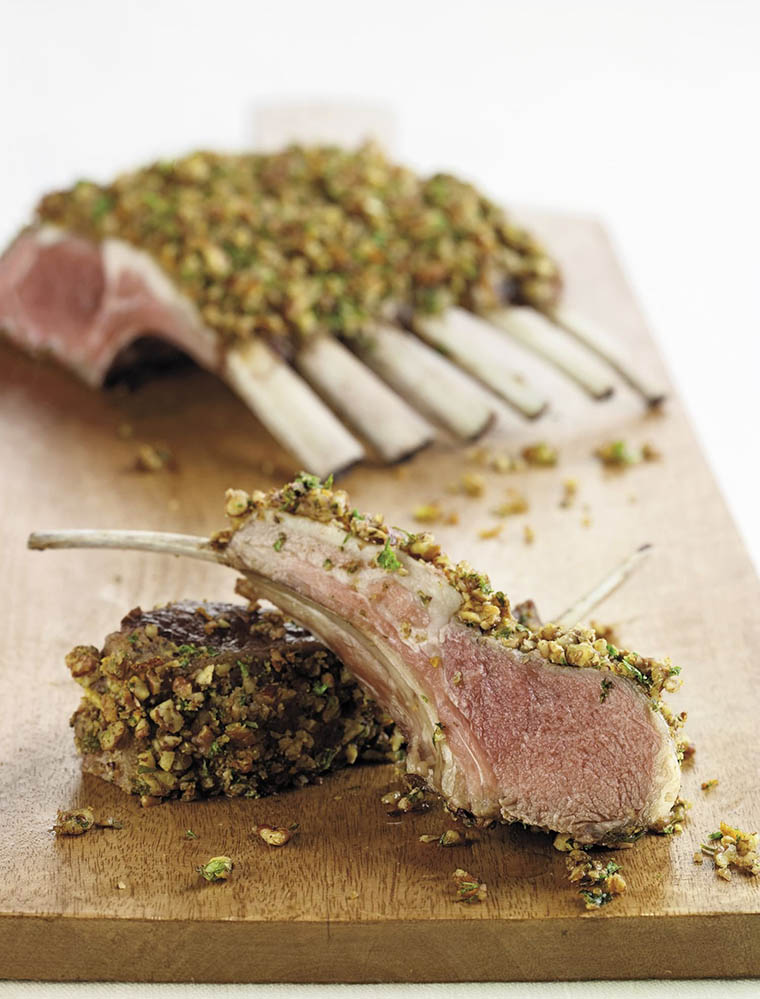 Remove the lamb racks from the oven and spread each rack on the meaty side with 1 tablespoon Dijon mustard. Divide the herb and nut mix equally between the racks and coat, gently pressing into the mustard.