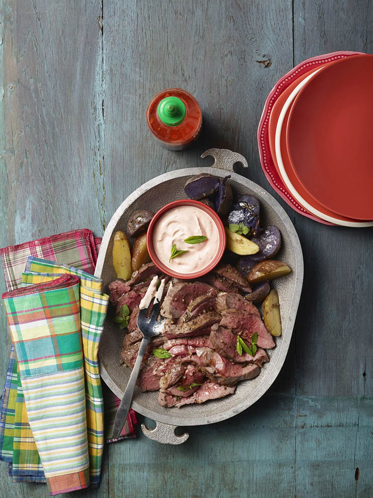 For the garnish: In a small bowl, mix the sour cream with the sriracha, kimchi sauce and mint oil. Season the sour cream with salt and pepper and refrigerate if making ahead. Spread some of the sour cream on each of four plates. Layer the sliced lamb on top with the halved potatoes alongside, and garnish with additional fresh mint.