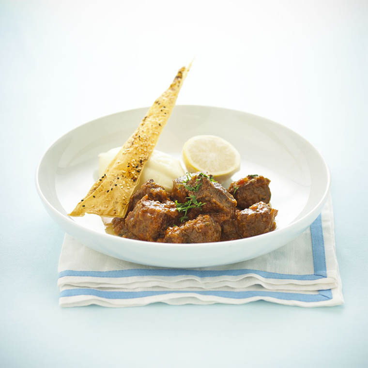Serve with garlic mashed potatoes and garnish with a wedge of lemon and crispy filo pastry wedge.